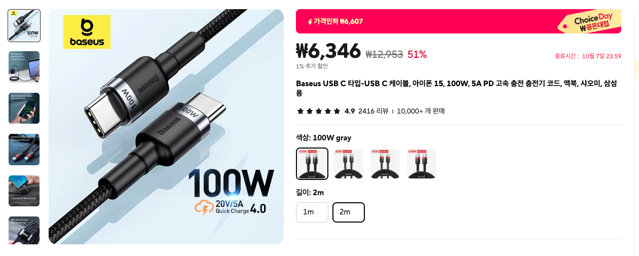 1) Baseus 고속 충전 케이블 - (사진을 클릭하면 제품 보기로~)