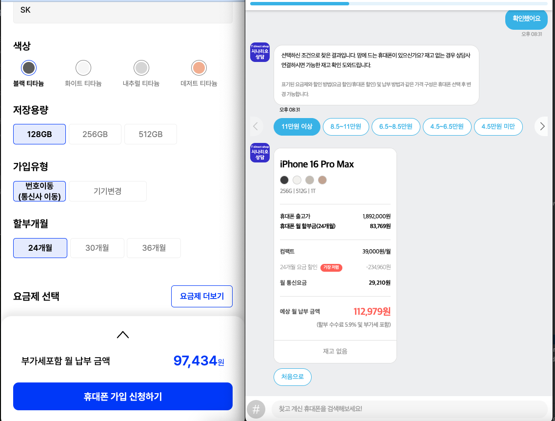 왼쪽이 원모바일 사이트고~ 오른쪽이 T다이렉트~
