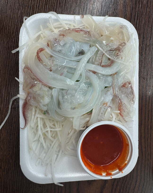 혼자라고 하니 구석 자리를 안내받았고, 옆자리 아주머니는 물회와 오징어회를 드시고 계셨습니다. 저도 눈치 보며 같은 메뉴를 주문했죠.