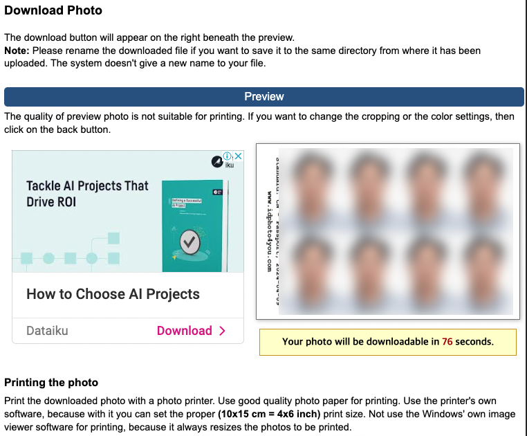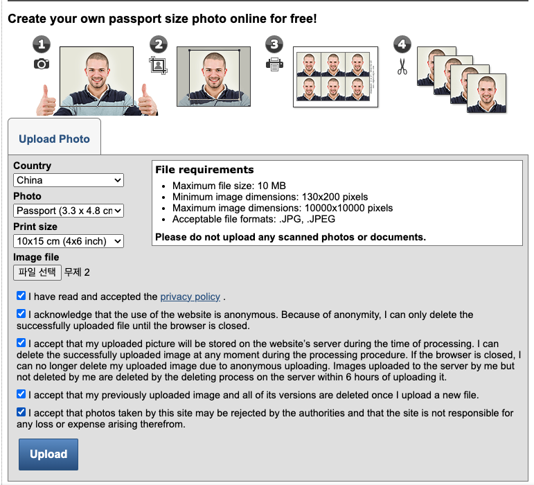 Create your own passport size photo online for free! Upload Photo Step-by-Step Guide Select the country, the photo type and the print size, and then upload a photo. Once the photo is uploaded, the Crop page opens. On the Crop page, you can cut the image us