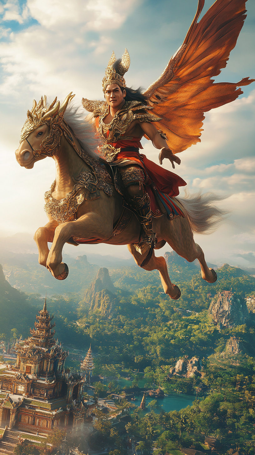 쑤다콘은 전통 태국 전사의 복장을 입고, 신화 속 용 말과 함께 하늘을 날며 고대 사원을 지나칩니다. 그의 눈빛엔 결의가 담겨 있습니다.