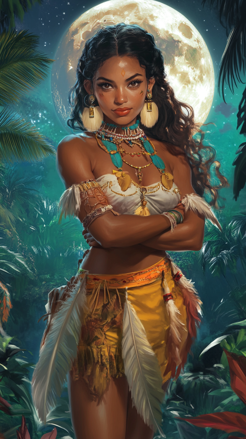 빛나는 달 아래, 전통 보석과 깃털로 장식한 아름다운 자시가 아마존 숲속에서 우아하게 춤을 춥니다. 반딧불이 그녀의 움직임을 밝혀 줍니다.
