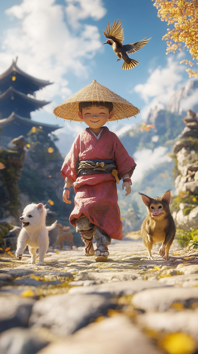 밝고 씩씩한 모모타로가 동물 친구들과 함께 오니의 섬으로 행진합니다. 개, 원숭이, 꿩이 그의 곁에서 용기를 북돋웁니다.