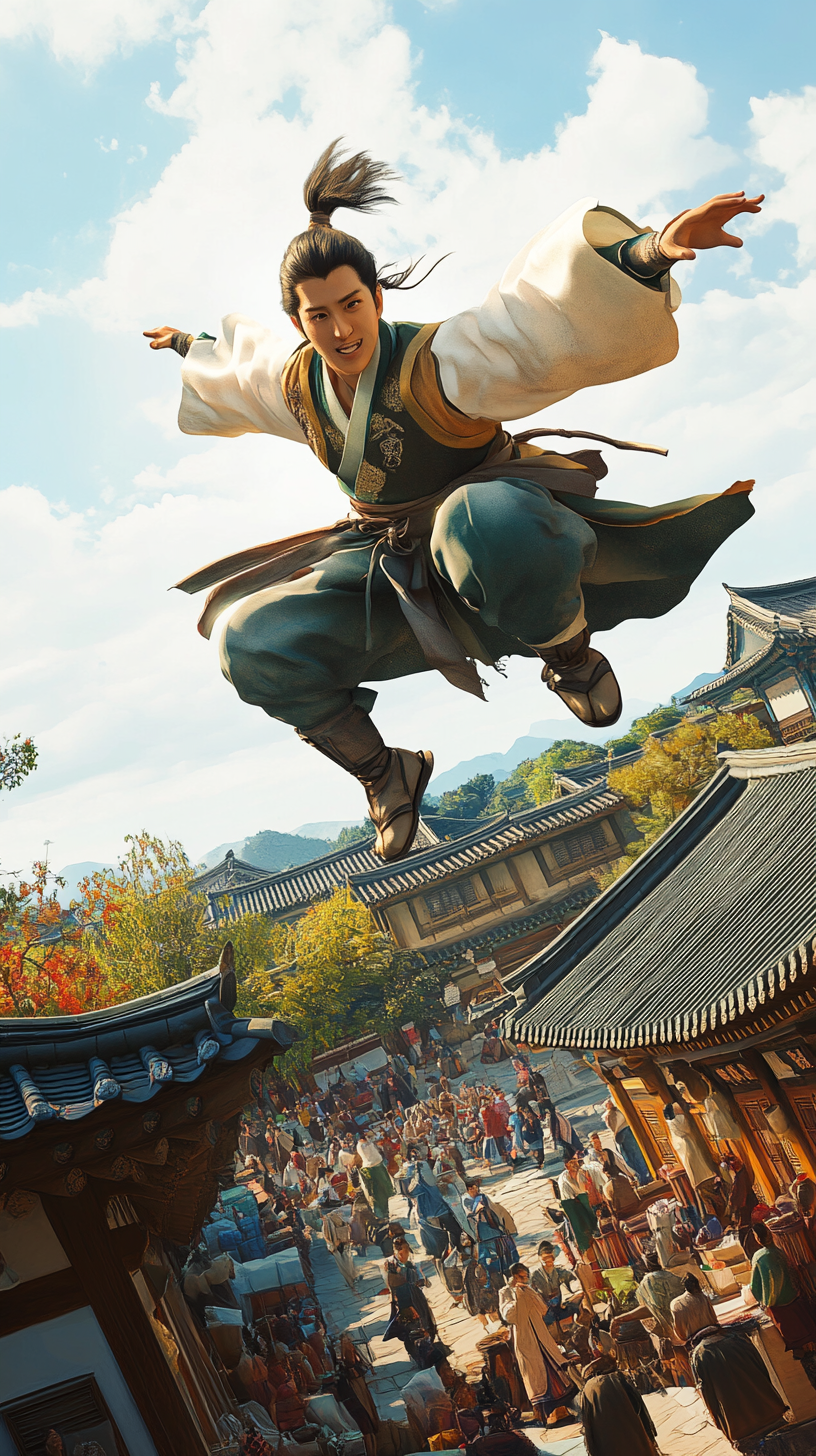 지혜로운 영웅 홍길동이 조선시대의 분주한 시장 위 지붕을 빠르게 넘나듭니다. 아래 사람들은 경이로운 눈빛으로 그를 바라봅니다.
