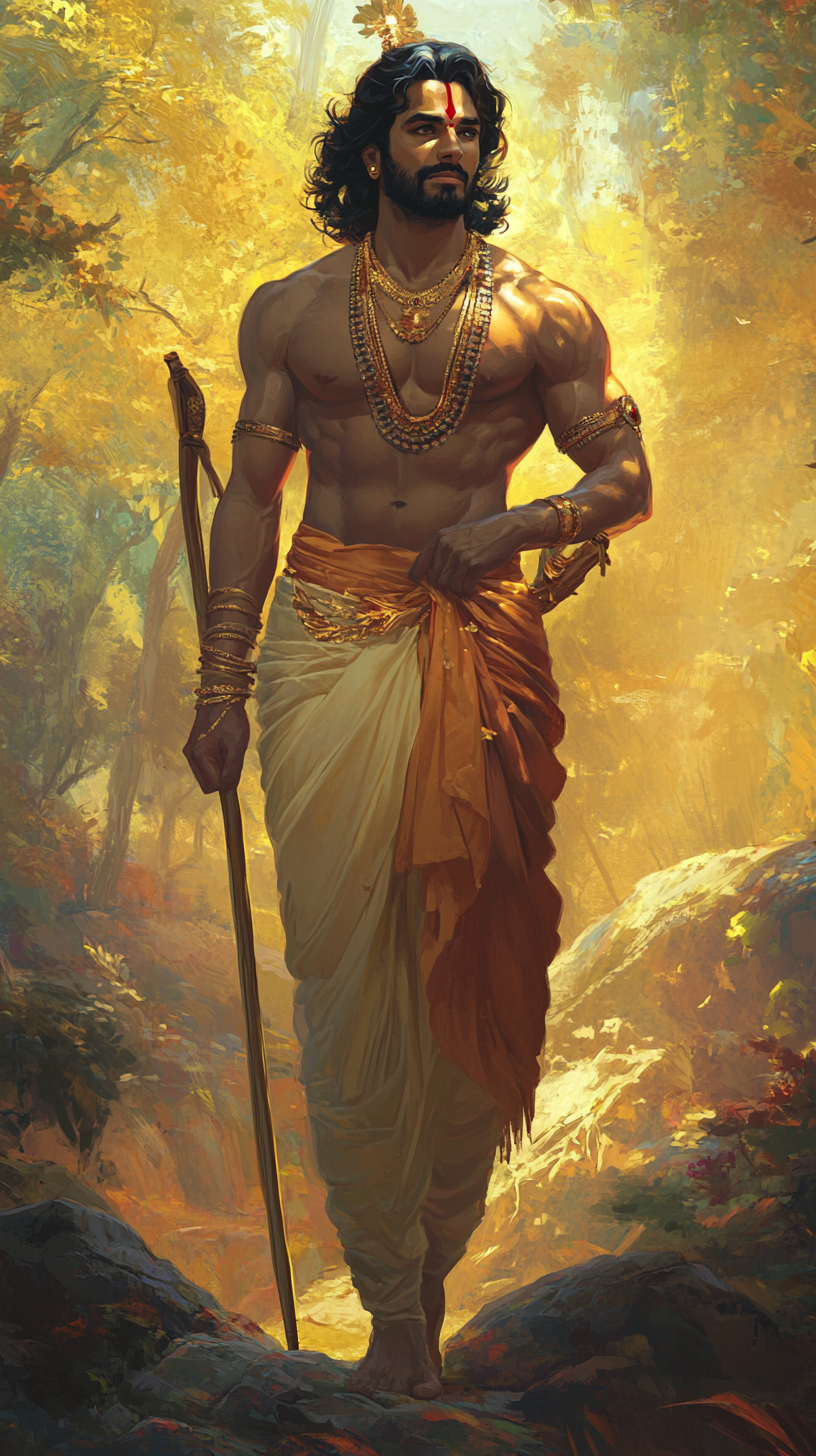 강인한 체격과 고귀한 얼굴을 가진 라마가 숲속으로 유배의 길을 떠납니다. 전통 왕실 의상을 입고, 아내 시타와 동생 락슈마나가 뒤따릅니다.