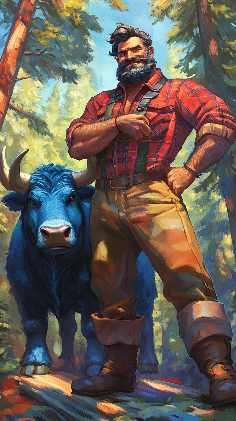 거대한 벌목꾼 폴 버니언. 그의 거대한 부츠가 숲속 땅에 커다란 자국을 남깁니다. 푸른 황소 베이브가 그 모습을 즐겁게 지켜보죠.